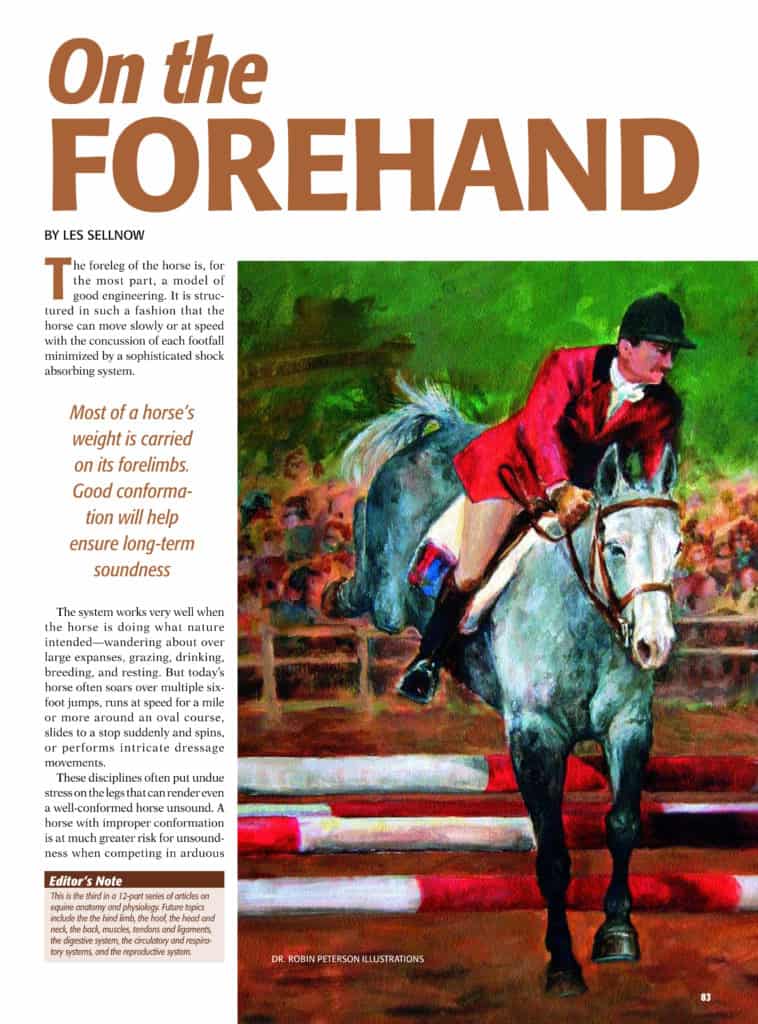 The foreleg of the horse is, for the most part, a model of good engineering. Most of a horse’s weight is carried on its forelimbs. Good conformation will help ensure long-term soundness.
